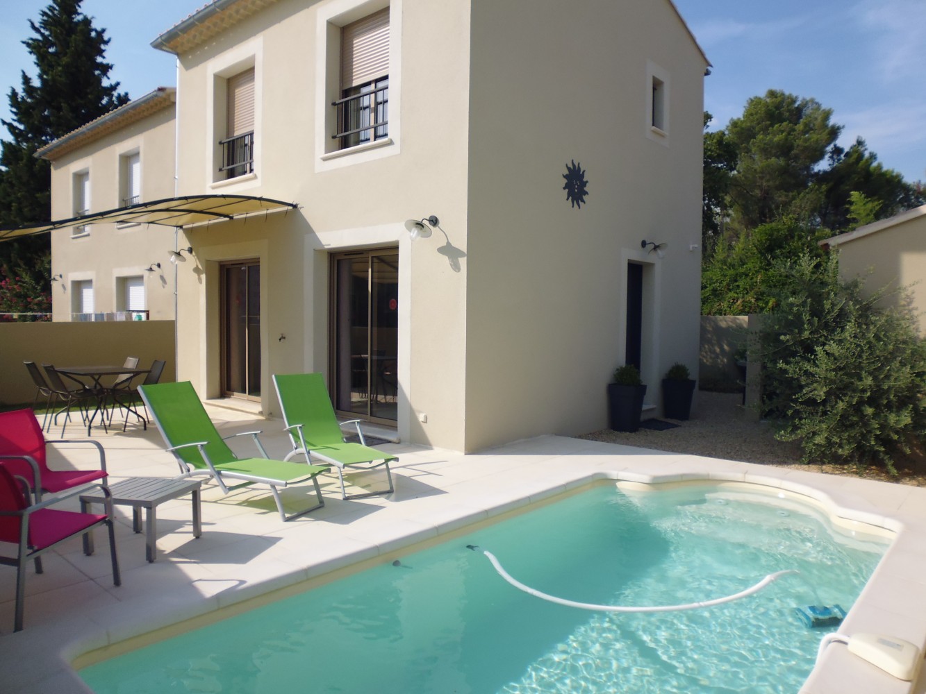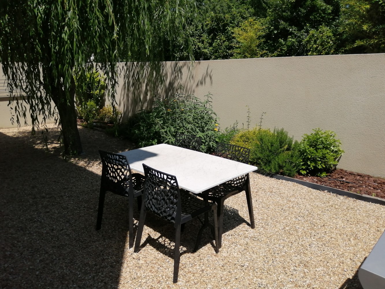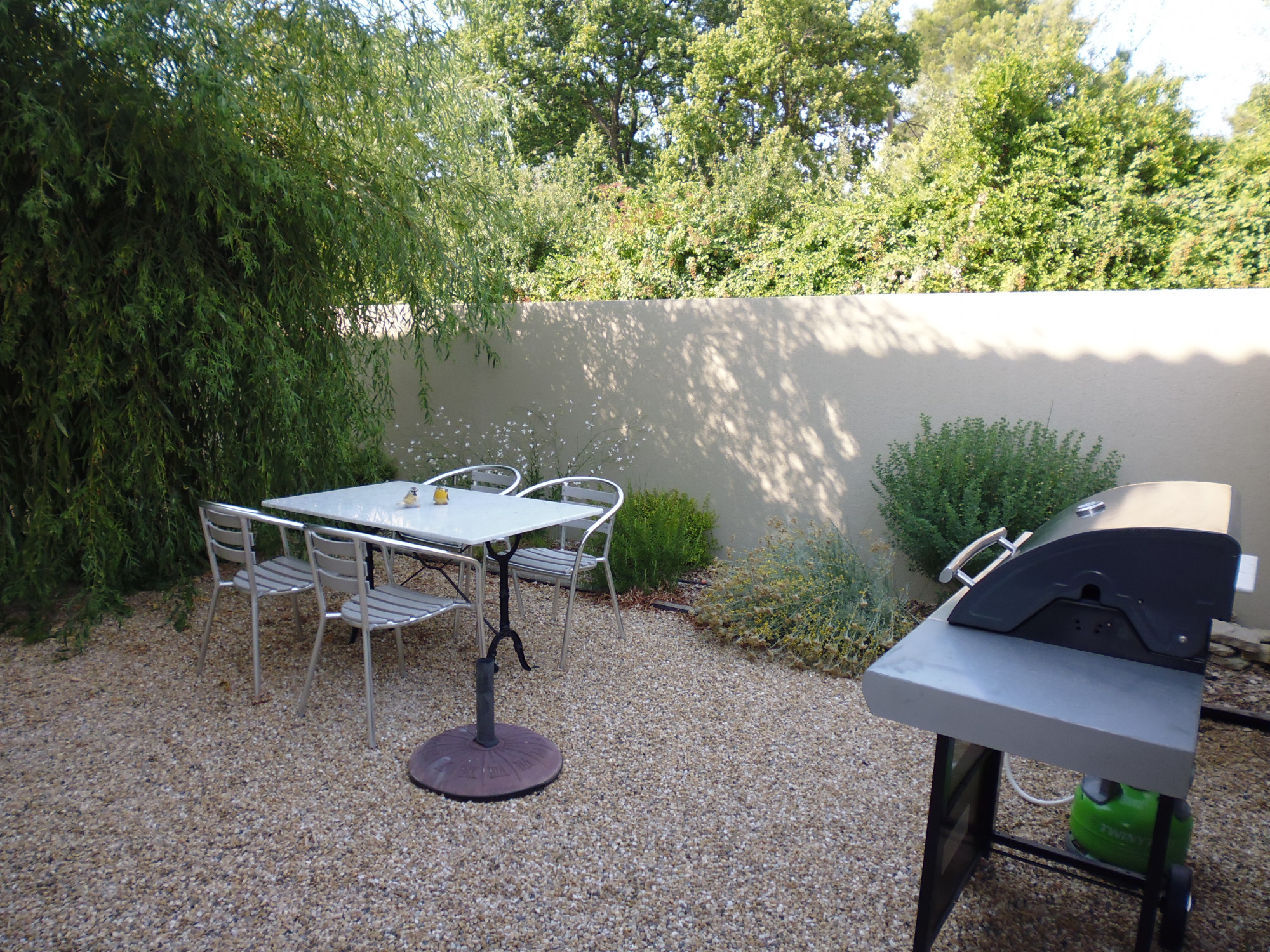 Après avoir stationné votre véhicule, vous pénétrez dans la propriété par un portillon. Le jardin paysagé, les senteurs, les cigales, la terrasse, la piscine, un coin plancha, l’abri du saule, l’ombre fraiche, un espace clos et cosy, calme… Les vacances commencent !