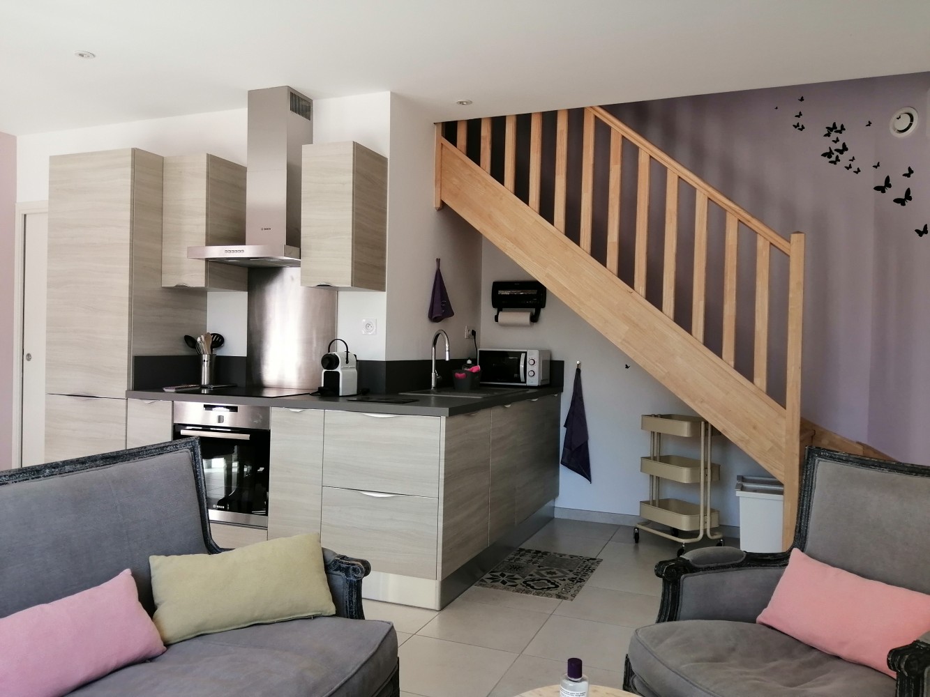 Au rez-de-chaussée de la villa, vous trouverez le salon, le séjour, une cuisine ouverte entièrement équipée, le WC, et un cellier.